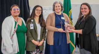 Accepting for the Washington Student Achievement Council were, left to right, Rubi Diaz, Grace Nelson and coordinator Crystal Hall; Productivity Board Member Mia Navarro presenting.