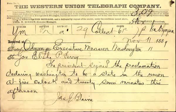 November 11th holds an extra-special place in the hearts of Washingtonians every year. We have a double reason to celebrate: to honor the contributions of our nation's veterans and to recognize the day Washington achieved statehood. So when we're all celebrating, we can wave both the American and Washington flags in thanks for our vets and in commemoration of Washington's 122 birthday. Above is the telegraph that Gov. Ferry received that said President Benjamin Harrison signed the proclamation declaring Washington to be a state. This 1933 photograph below features Governor Clarence D. Martin giving an apple (grown in Washington, we hope!) to a group of veterans from the 40 et 8.(Photo courtesy of the Washington State Archives)