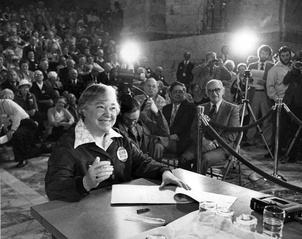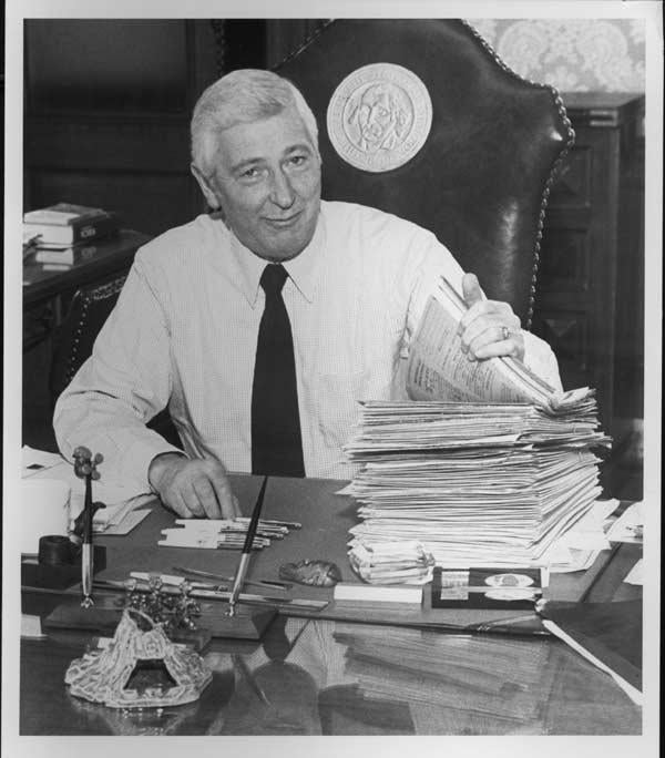 It’s Day 3 of our weeklong series of blog posts featuring classic State Archives photos of previous Washington governors signing bills into law. Today’s subjects are Dixy Lee Ray and John Spellman. The top photo shows Ray at a well-attended bill-signing ceremony in the Legislative Building Rotunda either in the late 1970s or in 1980. Then-Lt. Gov. John Cherberg is at right. The bottom photo features Spellman putting his signature on legislation in his office in 1981.Image