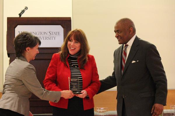 Secretary Wyman continued her statewide College Civics tour with a trip east to Pullman to Washington State University. Wyman and state Elections Director Lori Augino (center upper row, above) met with members of WSU's Panhellenic Council to discuss the importance of voting and being involved with the campus and the needs of the community. Wyman and Augino gave tips on finding great, convenient voter information and how to register online via www.vote.wa.gov and the services of MyVote. They also noted that the women are already campus leaders and can look forward to using their skills to lead their communities as volunteers, interns, business and non-profit leaders, parents, and running for office themselves. Later, Wyman spoke at the President's Leadership Awards ceremony, honoring outstanding student activists and mentors. Wyman was delighted to receive the award herself, as well. She is pictured below with Melanie Brown, Director of the Center for Civic Engagement at WSU and President Elson Floyd. Wyman said her first visit to the Pullman campus was outstanding and inspiring. Wyman will continue the College Civics tour with visits to 14 more campuses May 6-8.Image