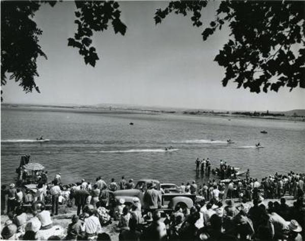 For many in the Northwest, a summer highlight is watching the hydros race on the Columbia River in the Tri-Cities in late July or on Lake Washington in Seattle a week later during Seafair. With the 48th running of the Columbia Cup races taking place this weekend at Columbia Park in the Tri-Cities, we checked the Digital Archives for a photo of an early boat race there. Sure enough, there was one. This photo, taken sometime before 1970, shows people at Sacajawea State Park, where the Columbia and Snake rivers meet, watching the racing boats speed by. The shot is part of the Digital Archives’ State Library Photograph Collection, 1851-1990.