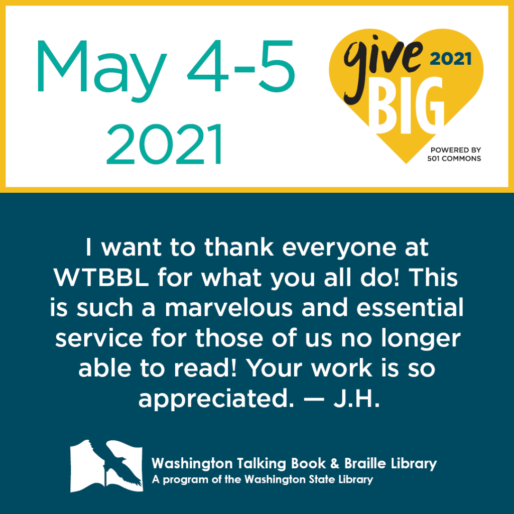 On May 4-5, WTBBL participated in Washington Gives' GiveBIG, a 48-hour online giving campaign that supports Washington state nonprofits. Thanks to the support and generosity of people all across our great state, WTBBL raised $10,000 toward equipment, collections, and additional programming for the Audiobook Production Department.