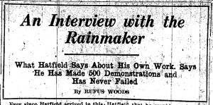 "The people around the Grant county seat want rain, and in fact they are willing to try any old scheme to get it, even to employing a professional rainmaker."