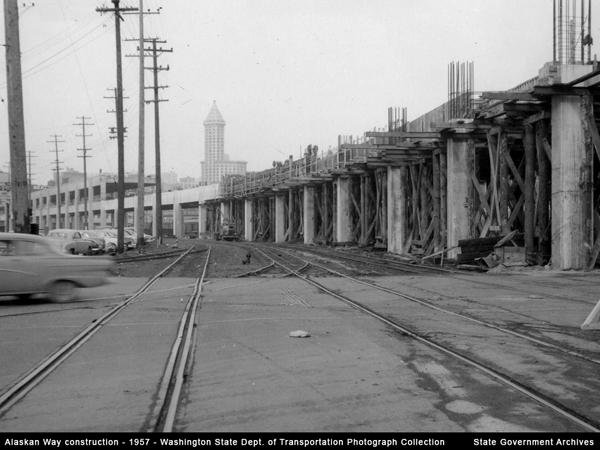 As Blood, Sweat & Tears sang in its 1969 classic “Spinning Wheel,” what comes up must come down. That’s the case for the south mile of the Alaskan Way Viaduct along the Seattle waterfront, as crews began tearing it down recently. The project to replace the viaduct with a tunnel is slated to begin late this year and is supposed to be completed in late 2015. For those of you wondering what it looked like when this section of the viaduct was going up, look no further. Our State Archives unearthed this photo (above) from its state Department of Transportation photo collection that shows the viaduct being built in 1957. Note how the Smith Tower dominated the Seattle skyline back then. The photo below is from WSDOT’s collection of the south mile’s demolition.