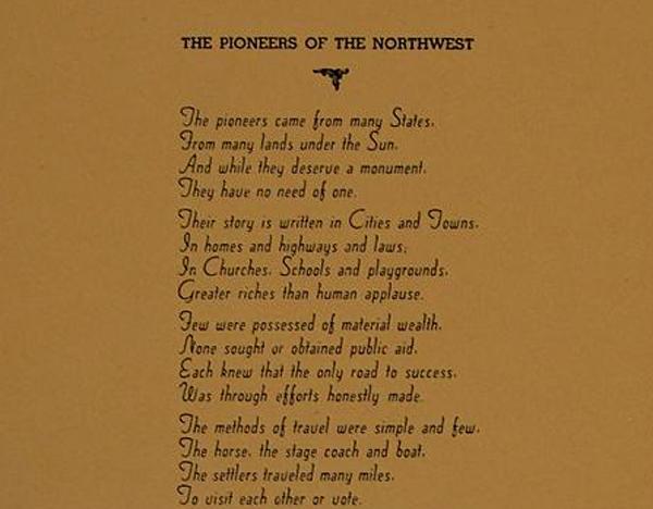 With April being National Poetry Month, it’s fitting to make a poem our first State Library “jewel” contestant for the month. Entitled “The Pioneers of the Northwest,” this ode was composed by W.E. McCroskey. The State Library staff doesn’t know for sure when it was written, but one guess is sometime between 1935 and 1945. The framed print possessed by the State Library has a note that states it was presented by the Colfax chapter of the Daughters of the Pioneers of Washington on Sept. 30, 1949. The poem reads:The pioneers came from many States. From many lands under the Sun. And while they deserve a monument. They have no need of one. Their story is written in Cities and Towns. In homes and highways and laws. In Churches, Schools and playgrounds. Greater riches than human applause. They were possessed of material wealth. None sought or obtained public aid. Each knew that the only road to success. Was through efforts honestly made. The methods of travel were simple and few. The horse, the stage coach and boat. The settlers traveled many miles. To visit each other or vote. They challenged the desert and made it bloom. They conquered the mountain slopes. They carved out an Empire in the West. Far exceeding their fondest hopes. The latch string was out for all alike. Their labor and food they shared. And to help a neighbor in distress. Neither time or effort was spared. Their children were taught to labor. Wives and mothers were brave and true. Few conveniences were had for their tasks. Many hardships and problems they knew. They built not alone for family and self. But made plain the paths ahead. That those who were to follow them. Might safely and worthily tread. We of the present and those to follow. Can not share in the hardships they knew. But we can express our gratitude. By always keeping in view: Their courage, wisdom and foresight. In building the heritage we claim. And by striving to ever be worthy. Of the Pioneer record and name.The poem is not to be reproduced without consent of the copyright holder and that it is provided here for educational purposes only. According to his obituary, McCroskey was born in Monroe County, Tennessee, and moved to Eastern Washington where he was admitted to the state bar in Whitman County in 1895. He practiced law in Palouse, Colfax and Walla Walla. McCroskey served as Walla Walla’s mayor and was a Democratic candidate for Lieutenant Governor. We’ll feature two other State Library jewels in the coming days. Afterwards, we’ll open our online poll to let you choose which one you like best.