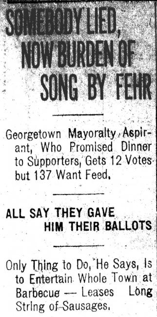 "The first day of his canvass he found twenty-six who swore they voted for him. Dr. Fehr scratched his head in amazement, asked each member of the election boards if they were honest, consulted City Attorney Charles Ennis about throwing out the whole election on account of fraud, and then decided to feed the twenty-six. That night Fehr's telephone bell rang repeatedly and each time he answered it a voter promised to attend the banquet in accordance with the preelection arrangement." "By sunrise Fehr had a list of thirty-five who voted for him, and the next night his intended guests numbered fifty-three. Then Fehr began to stave off the banquet. He refused to be called a 'quitter' but he acknowledged that he was sparring for time. It was believed that an indefinite postponement of the banquet would discourage the remaining voters in Georgetown. The voters not only knew their game but were hungry."Will Feed Whole Town